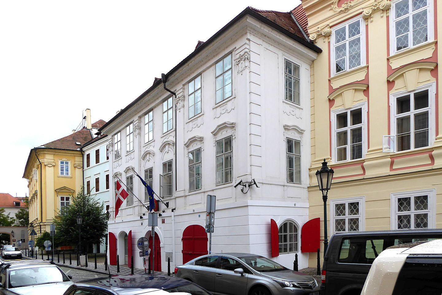 Das nächste Haus auf der linken Seite ist die Vertretung des Königreichs Dänemark. Daneben, etwas zurück versetzt, steht der Turba-Palast aus dem 17.Jh., in dem heute die Vertretung des Kaiserreichs Japan ihren Sitz hat. Dem gegenüber steht der Straka-Palast aus dem 17.Jh., auch Zu sieben Teufeln oder Zum weißen Pferdchen, in dem heute Konservatorium Jan Deyls für sehbehinderte siedelt.